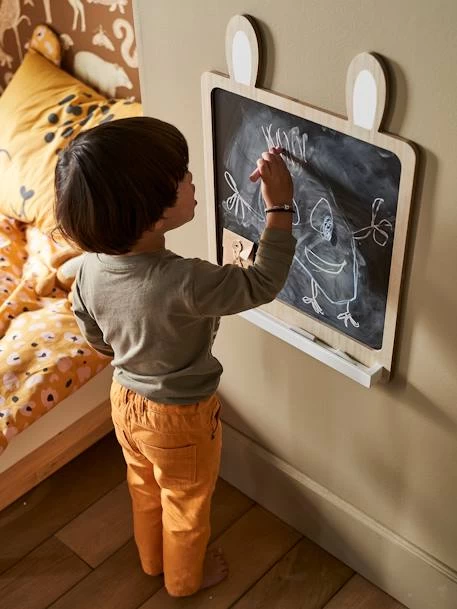 Avec cette chouette ardoise fixée au mur, les enfants pourront jouer à la maîtresse ou développer leurs talents d’artistes ! Elle possède un petit rangement très pratique pour y disposer les craies.
