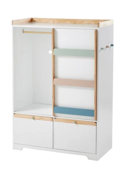 Une grande armoire aux belles astuces pour aider les petits à se débrouiller tous seuls ! Conçue à hauteur d’enfant, ils n’auront aucun mal à se créer eux-mêmes leurs tenues chaque jour. Elle dispose d’un côté penderie et d’un côté avec étagères pour ranger les habits. Un pan coulissant composé d’étagères de couleurs permet d’y disposer des livres et de fermer une partie de l’armoire. Sur la base, deux grands tiroirs coulissants peuvent recevoir les chaussures, les jouets, le linge de lit etc. Les différentes couleurs présentes sur cette armoire ont été imaginées pour que l’enfant puisse se repérer et trier plus facilement.