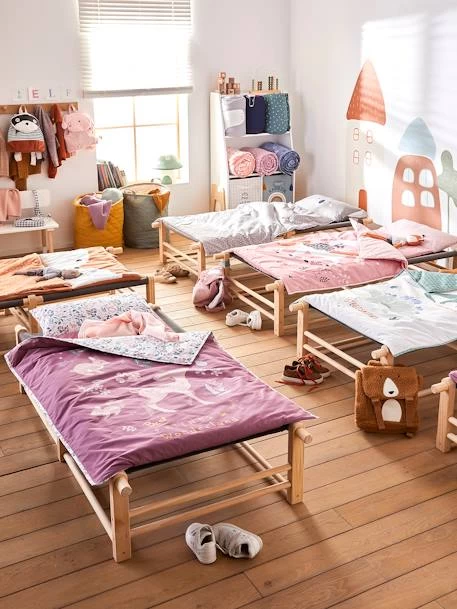 Lit de camp enfant en pin, avec toile grise en coton bâchette.