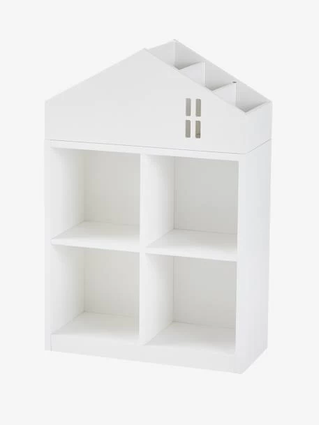 Le meuble à cases prend des allures de maisonnette grâce à sa partie haute en forme de toit, composée d’alcôves de rangement. Les petites découpes représentant la fenêtre apportent la petite touche design finale et font de ce meuble un élément très déco dans la chambre des enfants !