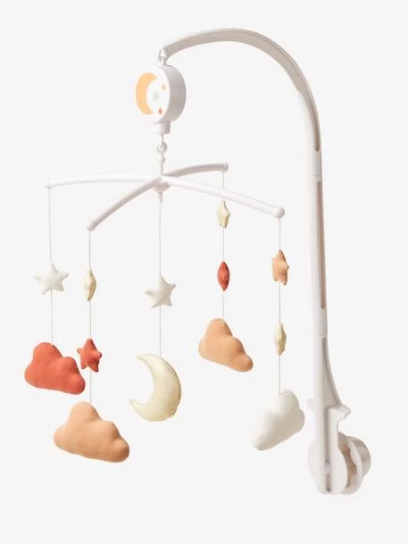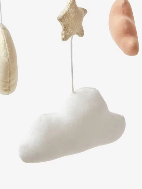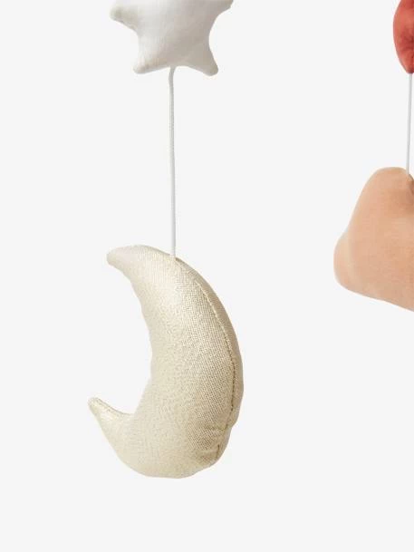 - 5 éléments en tissu imprimé et ouatiné 100% polyester : 1 croissant de lune glitter + 2 nuages en jersey camel et 2 nuages en coton (1 beige et 1 terracotta).