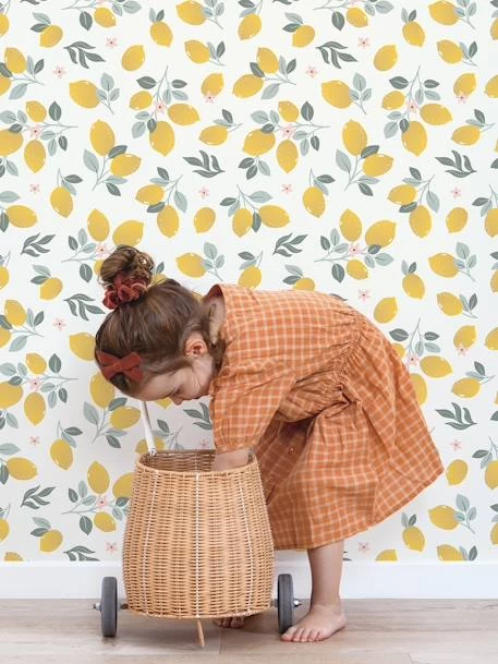 Petite touche ensoleillée grâce à ces jolis citrons dans un tourbillon de petites feuilles, ce papier peint design apportera une touche de couleur dans la chambre de vos enfants.