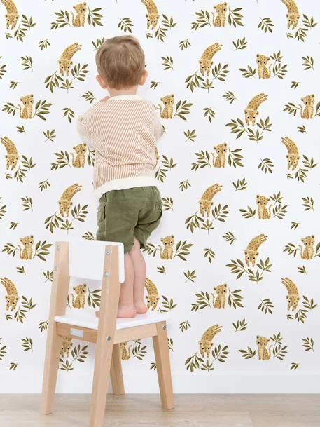 Retrouvez l’univers Felidae de Lilipinso avec ce papier peint aux couleurs chaudes et motifs vintages : les léopards sautent au milieu de la faune et la flore de la jungle.